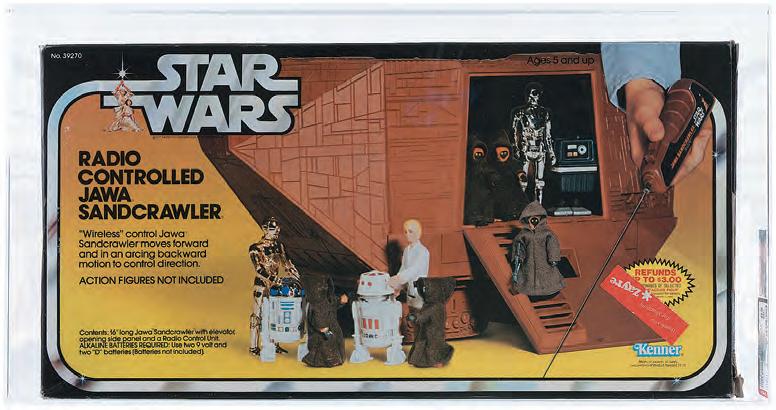 A boxed 16-inch-long Kenner “Star Wars” (1979) Radio-Controlled Jawa Sandcrawler is AFA-graded 85 NM+ and is part of a set that includes an elevator, opening side panel, and original radio control unit. The wireless control enables both forward and “arching” backward movement of the treaded vehicle which, according to “Star Wars” lore, was used by Jawas on the desert planet Tatooine. At the time of cataloging, only seven examples in AFA 85 grade were documented in the AFA Population Report. The one from Jacob’s collection is only the second in its exceptional grade ever to be auctioned by Hake’s. It is expected to achieve a winning bid in the $10,000 to $20,000 range.