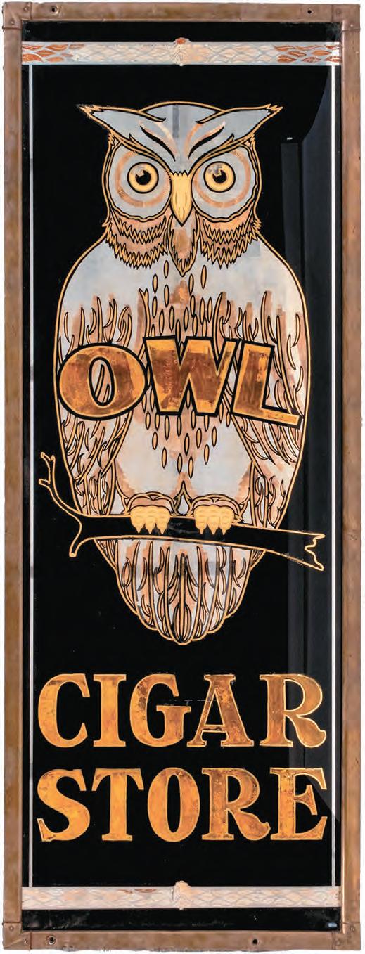 The owl “Cigar Store” sign was the sale’s runner-up top lot, and for good r eason. It’s one of the best reversepainted glass signs known to exist. Promoting the wide range of cigars sold under the “Owl” brand,