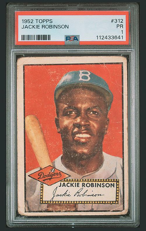 A 1952 Topps #312 Jackie Robinson baseball card, graded PSA 1 PR, from Topps’ fabled 1952 6th series, #311 Mickey Mantle to #407, considered the rarest series of the 407-card set, realized $5,900.