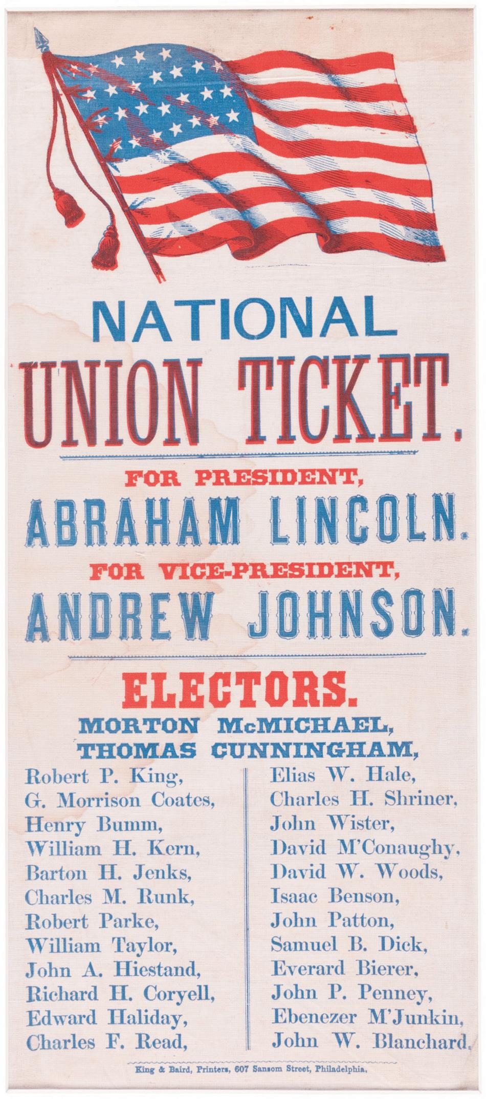 An important Abraham Lincoln and Andrew Johnson 1864 “National Union Ticket” fabric broadside with 26-star American Flag and names of 26 electors representing the Commonwealth of Pennsylvania is one of only three examples known to Hake’s political experts. Provenance from Rex and Patti Stark collection, it is estimated at $10,000 to $20,000.