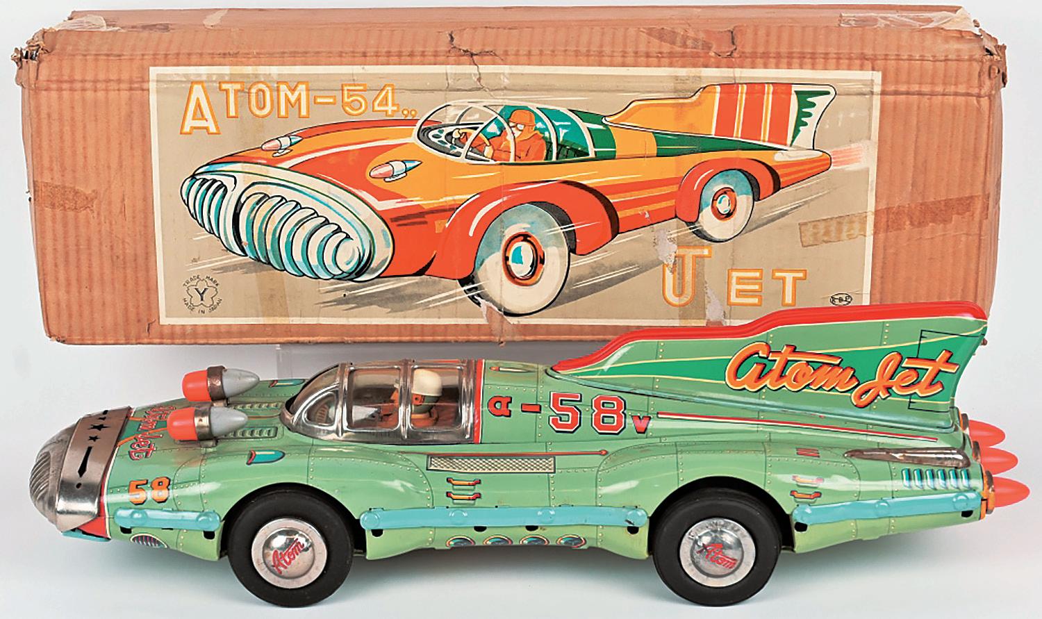 The grand marshal of the Japanese tin toy parade was a rare and coveted Yonezawa Atom Jet 58 Racer. Friction-powered and all original, including its tailfin, tires and hubcaps, the impressive 27-inch-long showstopper was offered complete with its original paper-label box.