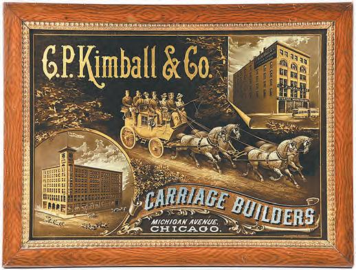 estimate range for $184,500. A rare ca. 1900 Mills Novelty Co. Violano Vir tuoso was described in the auction catalog as one of fewer than 20 known to exist. Presented in its quartered-oak cabinet with fine tiger-striping and an Art Nouveau bow-front window, this musically-gifted entertainer had been fully restored at some point in its past. It conveyed with all of its keys and six musical rolls, selling within its estimate range for $79,950. Anyone who has ever vis ited Chicago’s bustling central business district would have been amused by an outstanding ca. 1900 reversepainted glass sign advertising C.P. Kimball & Co., Carriage Builders, Michigan Avenue. It featured a large, impressive graphic of a quaint, early horse-drawn coach with well-dressed passengers, and additional depictions of the company’s manufacturing facilities. It was graded a condition 9.0 and sold for $54,120 against an estimate of $4,000-$10,000.