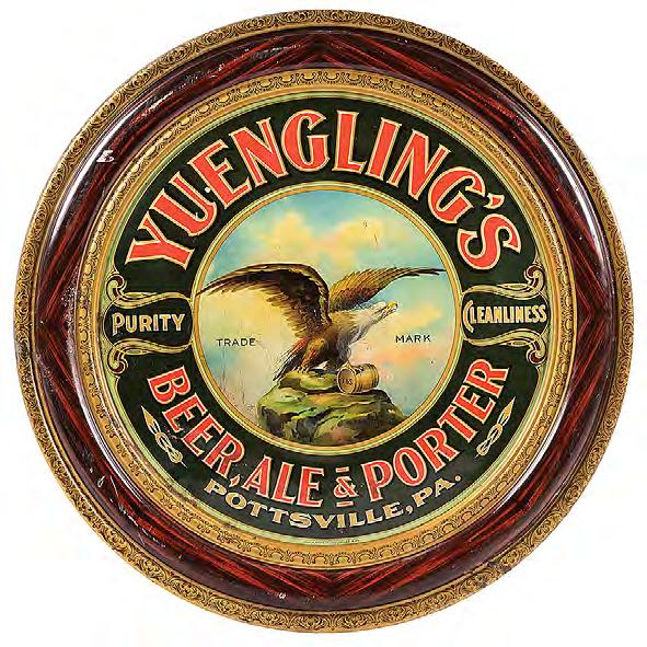 The Yuengling’s Beer, Ale & Porter single-sided self-framed tin sign, ca. 1900, Pottsville, Pa., depicting an eagle graphic at center and measuring 23.5 inches diameter, condition 8.0, sold above high estimate for $15,990.