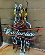 The double-sided Blatz Milwaukee Beer porcelain neon sign, on original metal can, ca. 1930s, glossy with deep navyblue field with white lettering, neon illuminated in red, overall excellent condition with sides graded 9.0 and 8.5+, respectively, sold for $11,685 against a $4,000 to $8,000 estimate.