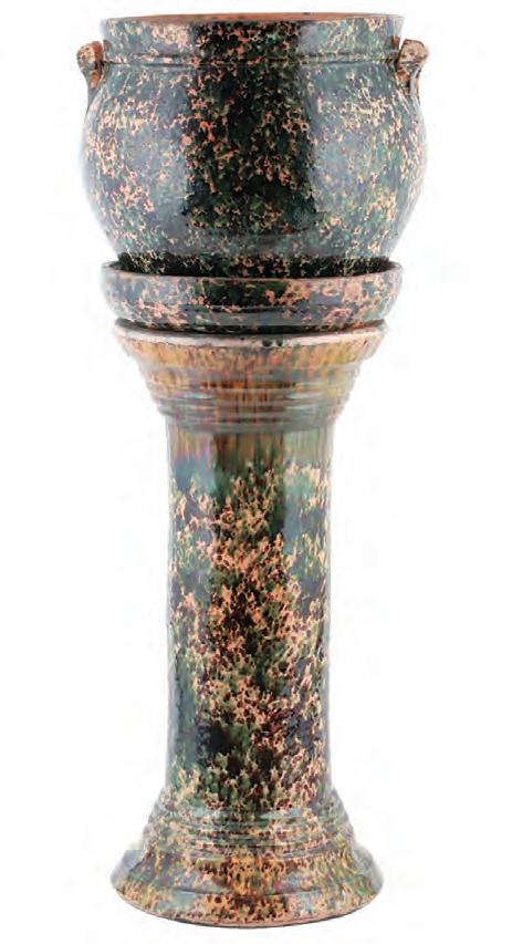 auction featured items consigned by descendants of Jacobi Pottery of Waterloo County, Ontario, which operated from 1874-1905. One standout was a monumental three-piece plant stand, nearly 30 inches tall, boasting a spectacular glaze with heavy green and brown mottling over a peach color base. It sold for $8,260. A Jacobi Waterloo creamer, 3.5 inches tall with extraordinary glaze, checked all the boxes for the winning bidder who purchased it for $3,245: glaze, form, rarity, condition and size.