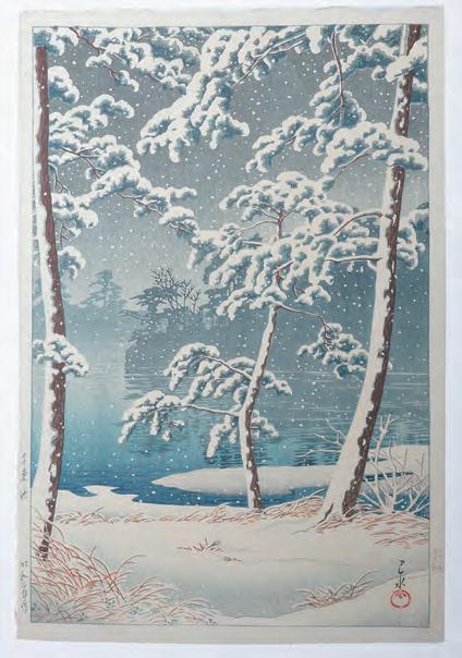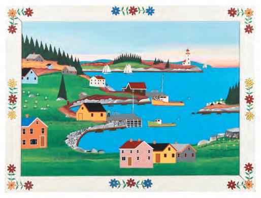 “Summer Cove, Flowers in Bloom,” realized $23,600. An acrylic-on-canvas by the British-born Canadian artist Ted Harrison (1926-2015), titled “Dawson City Evening” (1987), encapsulated the spirit of Canada’s North with a depiction of a wildly beautiful Yukon sky, signed and titled, sold for $17,700, and a 9-footwide pencil-and-markeron-paper banner by Halifax, Nova Scotia, artist Joe Sleep (1914-1978), titled “Fish Trawlers, Sailboat and Marine Life,” signed and dated (“Joseph Sleep 1977”) lower edge, garnered $7,080.