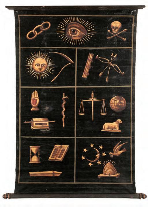 Fellows symbolic chart, also estimated at $800 to $1,200, sold for $17,500. This ca. 1870 oil-on-canvas work was illustrated with visual representations of the principles, degrees, and symbols associated with the order on a black background. A Knights of Pythias exploding desk with a sliding skull and cross bone painting was estimated at