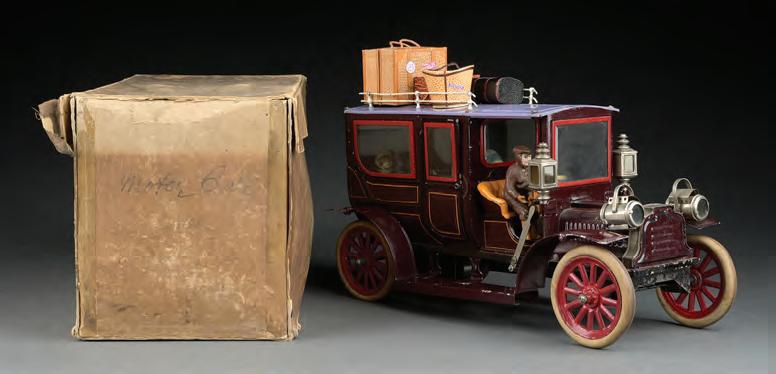 This ca. 1909-1912 hand-painted Carette clockwork limousine in scarce maroon color has the original box, retains original tires, headlamps and beveled glass windows. The estimate will be $30,000 to $40,000.