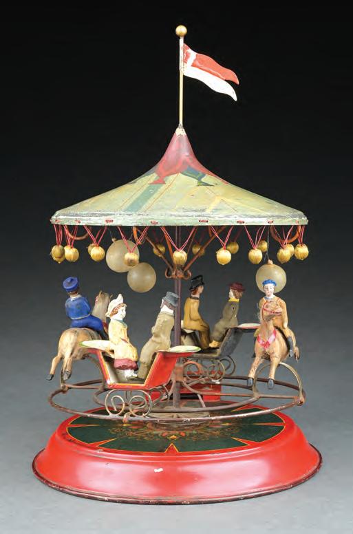 A rare Marklin hand-painted hand-crank carousel, Marklin Cat. Ref. 1125, with hand-painted trompe-l’oeil canopy simulating cloth, retaining original figures, horses and gondolas, the music box hand-crank section replaced, rest of toy retaining all original paint and graded excellent, will be estimated at $20,000 to $40,000.
