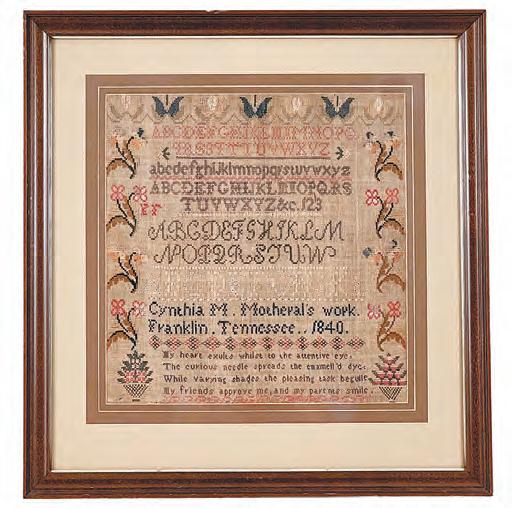 interest was an 1840 Tennessee alphabet sampler by Cynthia M. Motheral of Franklin, Tenn., which realized $8,337.