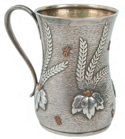 A rare and early Tiffany & Co sterling and mixed metal mug, ca. 1878, brought $3,335. Decorated in a Japonesque style,