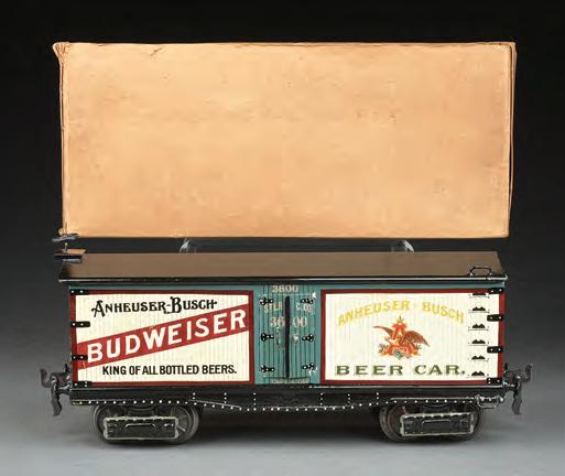 An exceptionally fine ca. 1906-1908 Marklin hand-painted I-gauge Anheuser-Busch Budweiser “King Of All Bottled Beers” refrigerator train car is estimated at $12,000-$18,000.