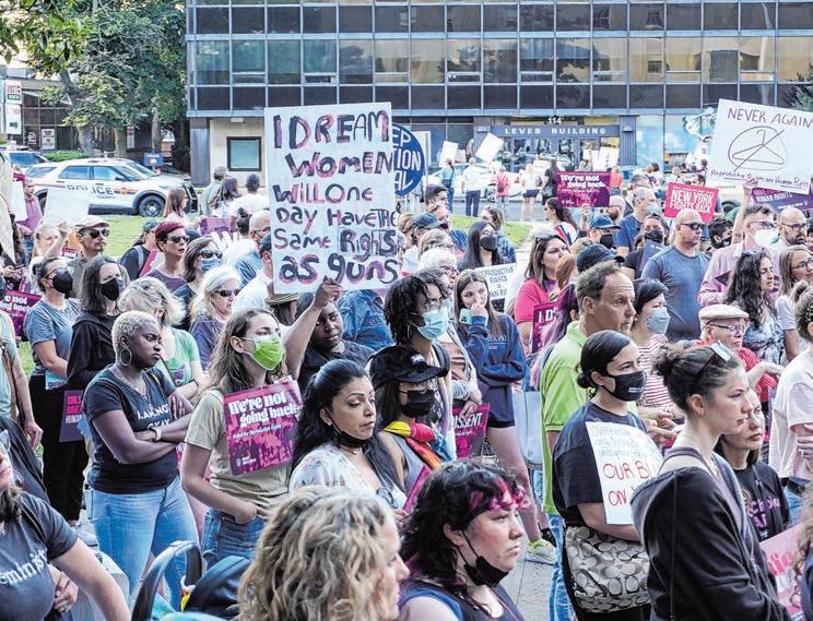 Around 150 people and 15 community and nonprofit groups gathered by Nassau County Courthouse to protest the landmark U.S. Supreme Court ruling in Dobbs v. Jackson Women’s Health Organization, which serves to overrule both Roe v. Wade and Planned Parenthood v. Casey, two previous federal rulings that protected the right to pregnancy termination in the United States.