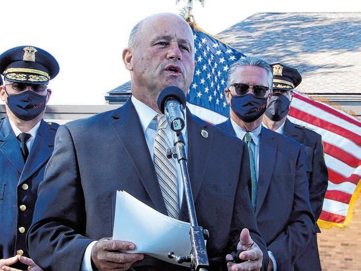County Police Commissioner Patrick Ryder at a meeting with Manhasset residents concerned over rising crime earlier this summer. Police Officer Janice Whitney, pictured in 2016, shows off her anti-ballistic vest and helmet. Officers are now trained to respond to school shootings without waiting for backup. (Photo by Frank Rizzo)SCHOOL SAFETY from page 3