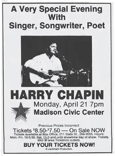 and hunger, grew alongside his family in the years leading up to his untimely death. Following his death, Chapin’s widow sued the manufacturer of her husband’s car and of the truck that struck him, as well as the related food distributor. The Harry Chapin Foundation was created in his honor.