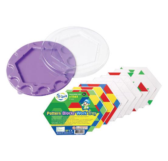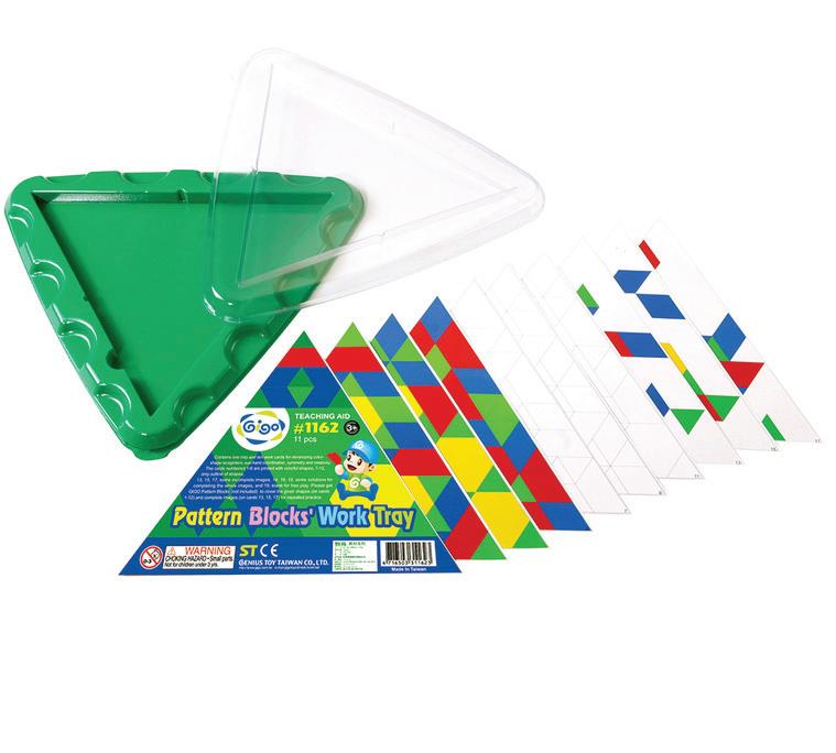 Σετ με 20 κάρτες διπλής όψης με βασικά σχέδια Pattern Blocks. Κατάλληλο για τη διδασκαλία των γεωμετρικών σχημάτων και της συμμετρίας Η βάση με τις κάρτες για Pattern Block εξοικειώνει τα παιδιά με τη χρήση των γεωμετρικών σχημάτων μέσα από την συμπλήρωση του εξαγώνου/τριγώνου με το συνδυασμό διαφόρων σχημάτων. Εκτός από τη βάση με πλαστικό καπάκι, συμπεριλαμβάνονται επίσης 9 καρτέλες διπλής όψεως και μια λευκή για ελεύθερο παιχνίδι. Κατάλληλο για τη διδασκαλία των σχημάτων, της συμμετρίας, της γραμμικής μέτρησης αλλά και του εμβαδού,