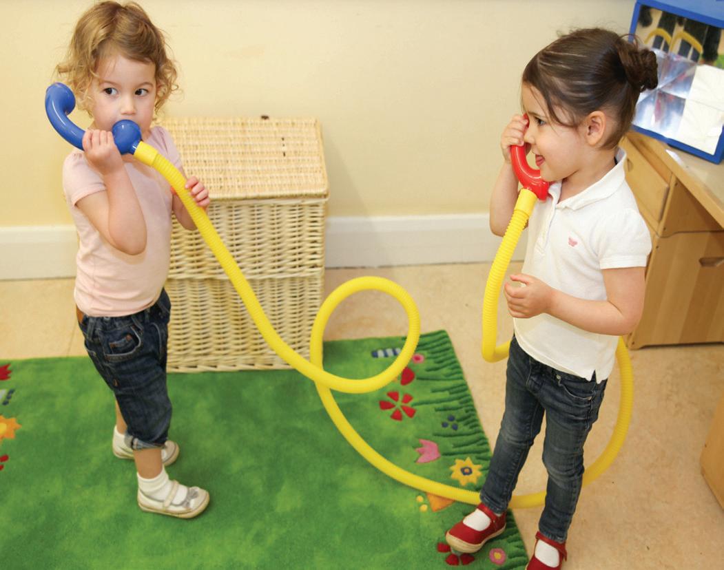 εποπτικό μέσο για την ανάπτυξη της επικοινωνίας μεταξύ των παιδιών. Μπορεί να χρησιμποιηθεί στο σχολείο, στην τάξη, στην αυλή, στην εξοχή, στο σπίτι, σε εσωτερικούς και εξωτερικούς χωρόυς, σε μικρές και μεγάλες αποστάσεις, μεταξύ δωματίων κτλ. Το σετ συμπεριλαμβάνει 2 ακουστικά και 3 μέτρα ευλίγιστο πλαστικό λάστιχο. Τα ακουστικά απλά εφαρμόζονται στο λάστιχο.