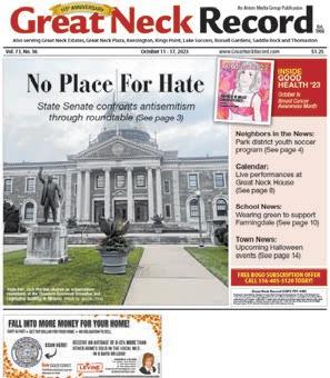 Also serving Great Neck Estates, Great Neck Plaza, Kensington, Kings Point, Lake Success, Russell Gardens, Saddle Rock and Thomaston Est. 1908 An Anton Media Group Publication Vol. 74, No. 4 March 6 – 12, 2024 www.GreatNeckRecord.com $1.25 Postmaster: Send address changes to Long Island Community Newspapers, P.O. Box 1578, Mineola, N.Y. 11501. Entered as periodicals postage paid at the Post Office at Mineola, N.Y. and additional mailing offices under the Act of Congress. Published 51 weeks with a double issue the last week of the year by Long Island Community Newspapers, 132 East Second St., Mineola, N.Y. 11501 (P.O. Box 1578). Phone: 516-747-8282. Price per copy is $1.25. Annual subscription rate is $26 in Nassau County. Great Neck Record (USPS 791-440) CALL 516-403-5120 TO START A SUBSCRIPTION TODAY! ANTONMEDIAGROUP COMMUNITY JOURNALISM •• 40 Years Neighbors in the News: The Interfaith Food Pantry needs donations (See page 4) Calendar: Park District offers movie screenings this weekend (See page 6) Sports and Recreation: Snowman Showdown highlights (See page 8) Long Island Weekly: A look back at Bob Dylan’s 1974 tour (See page 10) INSIDE GOOD HEALTH ’24 Choosing a home aide CHOOSING A HOME AIDE Staying Healthcaretick-freesubscriptions ‘ MARCH 6–12, 2024 ANTON MEDIA GROUP SPECIAL Public officials and representatives from multiple school districts hope to influence Governor Hochul’s budget. (Photo by the Office of Senator Steve Rhoads) Deep Cuts A number of school districts will see a drop in state aid under proposed budget (See page 3) Don't wait. Let’s talk about the upcoming spring real estate market. AYALA SIOUNI REAL ESTATE SALESPERSON 516.466.4036, C.917.405.2049 AYALASIOUNI@DANIELGALE.COM Each office is independently owned and operated. danielgale.com 244591 R