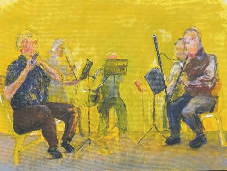 in New Mexico on the road to Ghost Ranch, and The Quintet which portrays a woodwind musical group who perform frequently at The Harborside. Additionally, there are two art pieces from a series of six collaborative collages