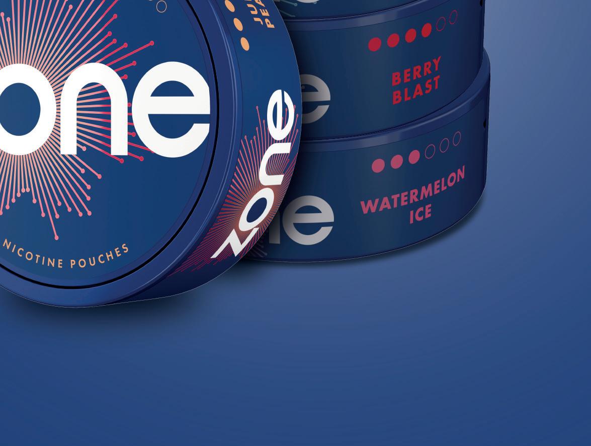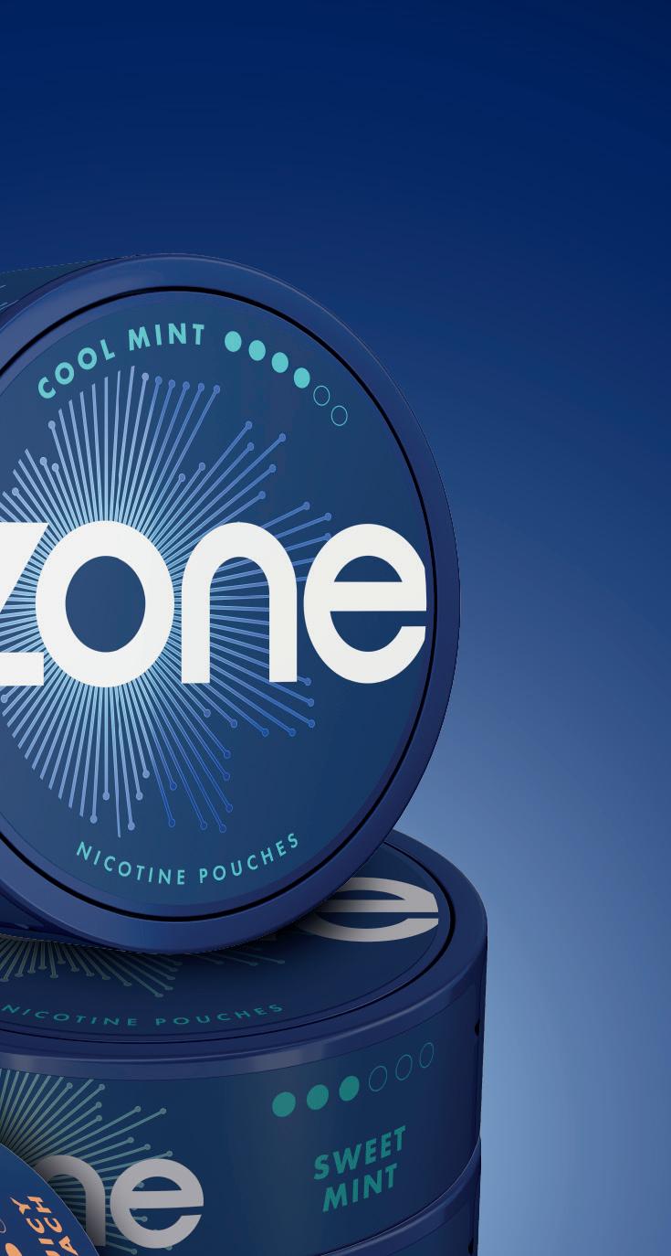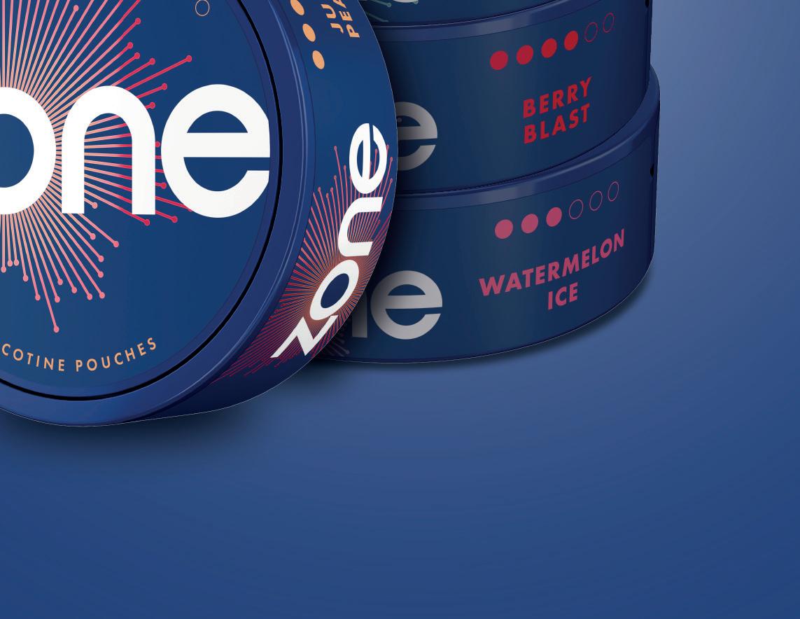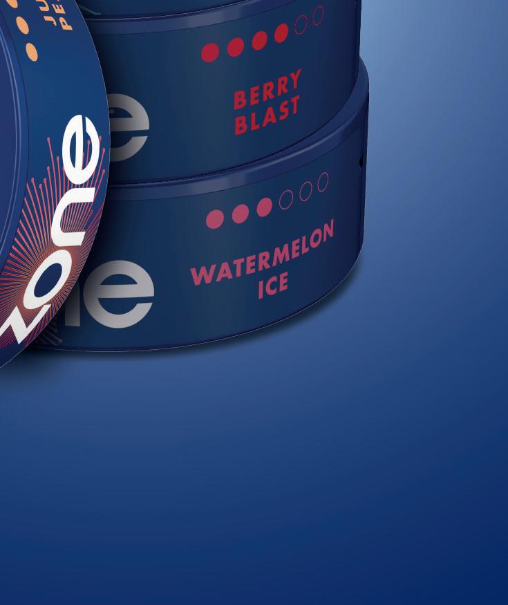 Zone comes in Sweet Mint, Cool Mint, Watermelon Ice, Juicy Peach and Berry Blast avours. Imperial states that 9–12mg strength products currently account for 43.4% of the nicotine pouch market [EPoS data October 2021 – June 2025] and Zone is available in 10mg nicotine strength across all its avours. Cool Mint and Berry Blast are also available in a higher 11mg nicotine strength variety.