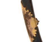 822. A FRENCH NAVAL OFFICER’S DIRK , 25cm sharply curved blade with clipped back point, decorated with stands of arms highlighted in gilt on a blued ground, characteristic gilt hilt decorated with scrolling foliage and fouled anchors, lion’s head pommel, reeded mother-o’-pearl grips, contained in its copper gilt scabbard decorated with acanthus scrolls, a trident and a fouled anchor.