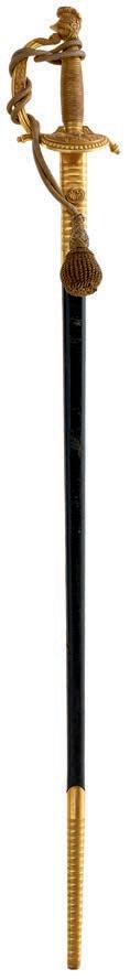 806. A GOOD NORWEGIAN NAVAL OFFICER’S SWORD AND BELT ENSEMBLE , 74.5cm blade by Eickhorn of Solingen, etched with scrolling foliage, naval vessels and crowned anchors, regulation gilt hilt, the guard pierced with scrolling foliage and a crowned anchor, wire bound ribbed celluloid grip, contained in its brass mounted leather scabbard, complete with knot and belt. By repute the sword of a Norwegian Submarine Commander who served near British shores and settled in Britain after the war.