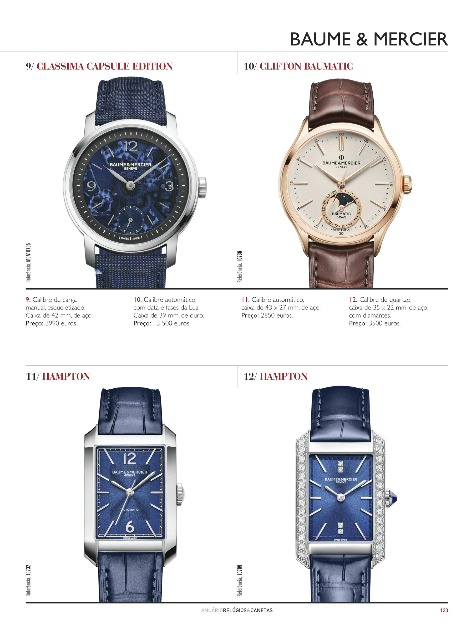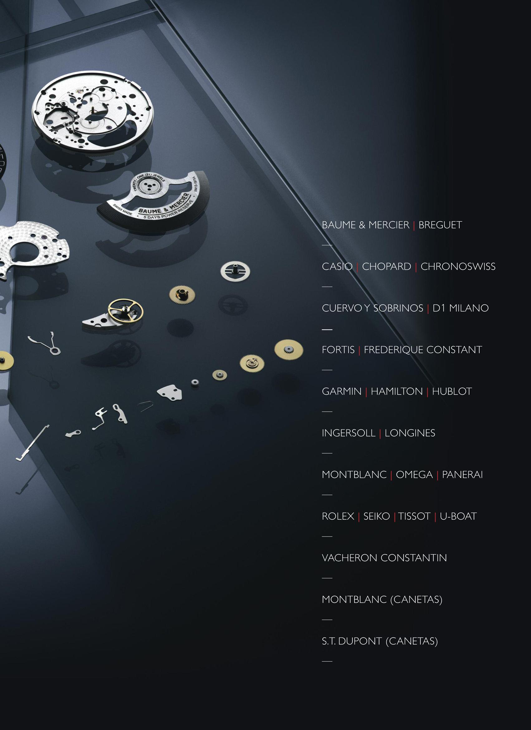 Aerowatch, Arnold & Son, Artya, Ball, Baume & Mercier, Bell & Ross, Breitling, Bremont, BRM, Bugatti, Byrne, Carl Suchy & Söhne, Cartier, Chopard, Chronoswiss, Concord, Corsano, Corum, Cyrus, David Candaux, Dior, Eberhard, Emera, F P Journe, Frederique Constant, Garmin, Girard-Perregaux, Grand Seiko, H. Moser, Hermès, Hublot, IWC, Jacob & Co., Jaeger-Lecoultre, Konstantin Chaykin, Kross Studio, Louis Erard, Louis Moinet, Maurice de Mauriac, MB&F, Minase, Montblanc, Montjuic, Moritz Grossmann, Nomos, Omega, Panerai, Parmigiai Fleurier, Patek Philippe, Ralf Lauren, Raymond Weil, Reservoire, Ritmo Mundo, Seiko, Spaceone, Speake-Marin, Swatch, The Solution, Tudor, Urwerk, Vacheron Constantin, Vulcain, Watchmakers United, Zenith, ZRC.
