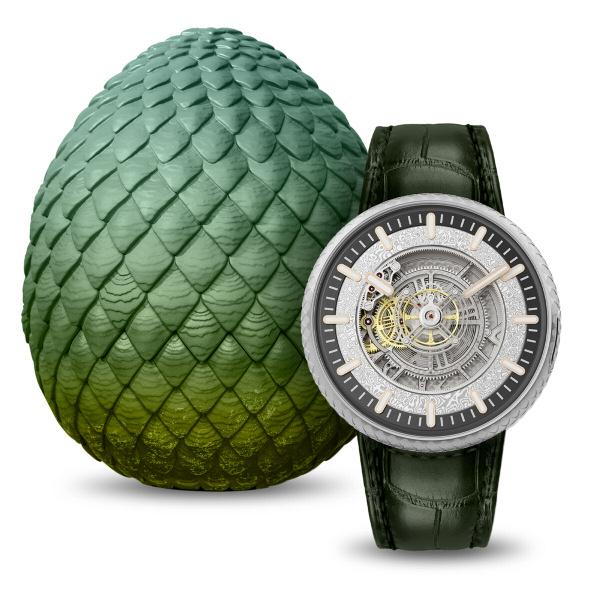 Relógio e ovo Cada conjunto é exemplar único Caixa de 45 mm, de titânio Calibre de carga manual, turbilhão voador central Autonomia de 5 dias O ovo, de resina, mede 231 5 x 214 9 x 168 mm, e epsa 2,2 kg Preço: 108 mil francos