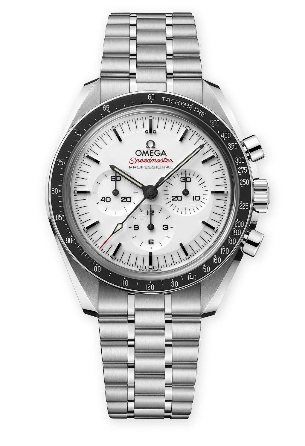–O cronógrafo “Moonwatch” tem agora uma versão com mostrador branco Caixa de 42 mm, de aço Luneta de alumínio Certificação Co-Axial Master Chronometer Calibre de carga manual