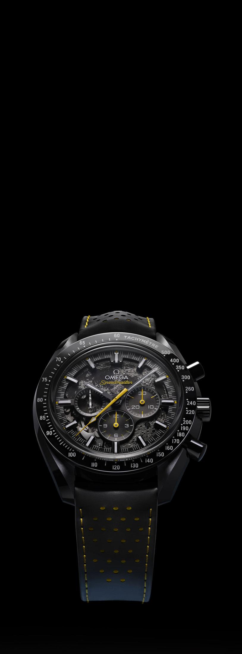 Calibre de carga manual, com certificação Co-Axial Master Chronometer, Caixa de 44,5 mm, de cerâmica preta Mostrador esqueletizado, de alumínio Criando uma estética única em todo o design, o calibre 3869 do relógio apresenta uma representação da superfície lunar feita através de ablação a laser na platina principal e pontes enegrecidas Tal como a Lua, este movimento revela dois lados diferentes O lado do mostrador representa a nossa visão da superfície lunar, como vista da Terra, enquanto o verso do relógio mostra o “lado escuro ” que apenas os astronautas conseguem ver
