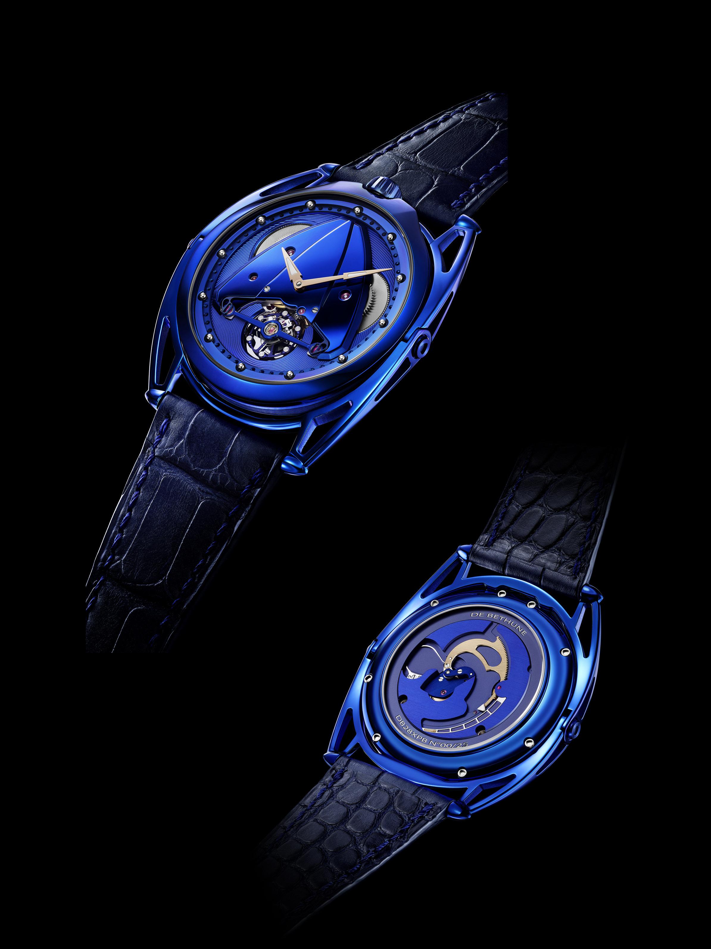 5 Cinco exemplares, com decoração em padrão abstracto, inspirado nos móveis do combóio E evoca outra espia, Mata Hari A parte superior da tampa abre-se para revelar um relógio autómato em miniatura com um movimento mecânico e um mostrador esmaltado