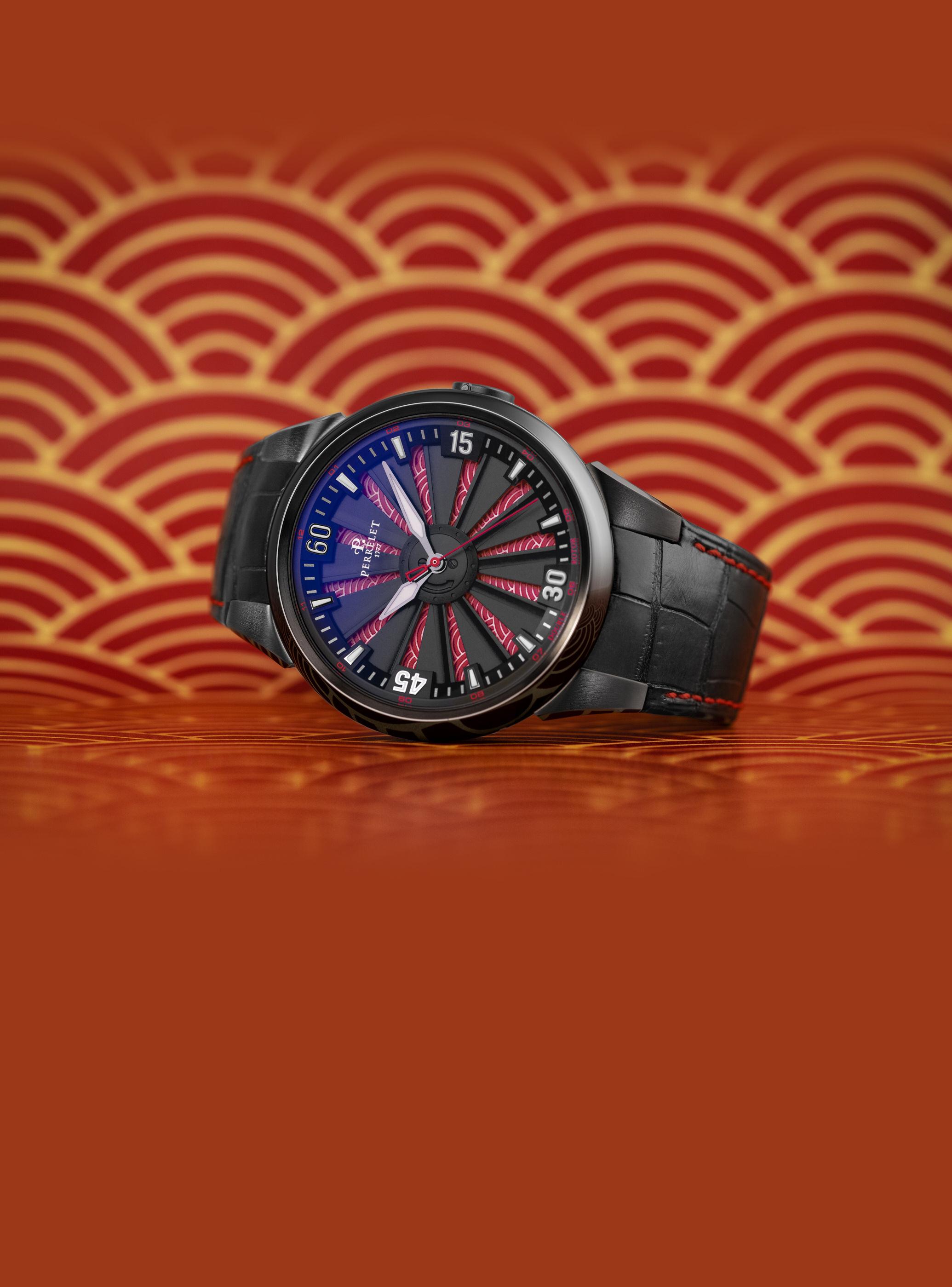 conjunto limitado a 10 exemplares caixa de 45 mm, de titânio calibre de carga manual, com 5 dias de autonomia turbilhão central o ponteiro das horas está afixado num mecanismo periférico que orbita 360 graus em redor do turbilhão os minutos são mostrados num disco que faz uma revolução por hora inclui umholofote de led com a projecção do sinal do batman preço: 100 mil dólares