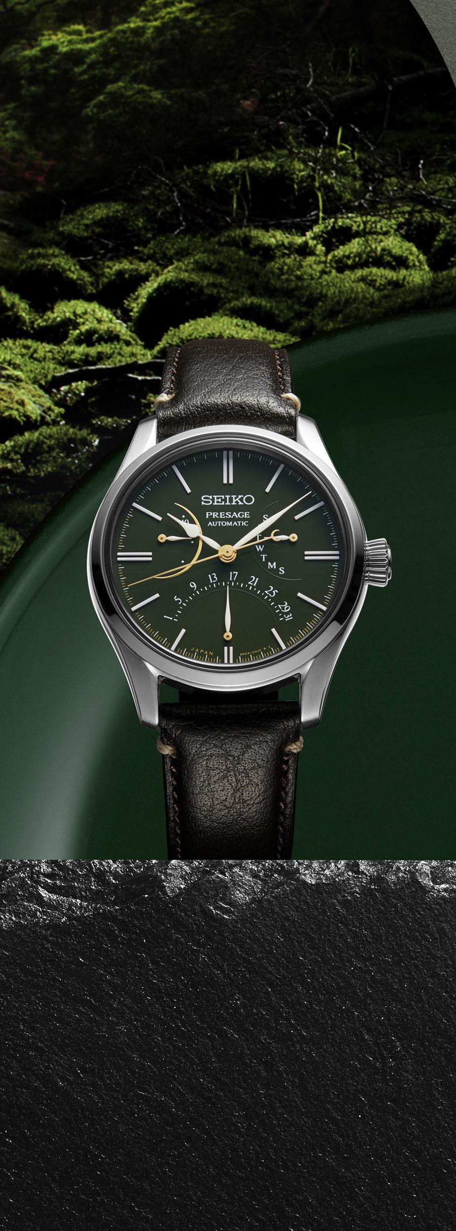 duas versões: uma, com mostrador moonshine™ gold, luneta de cerâmica preta e submostradores pretos; a outra, com mostrador revestido a pvd verde e luneta de cerâmica verde cronógrafo de carga manual, cronómetro certificado metas caixa de 42 mm