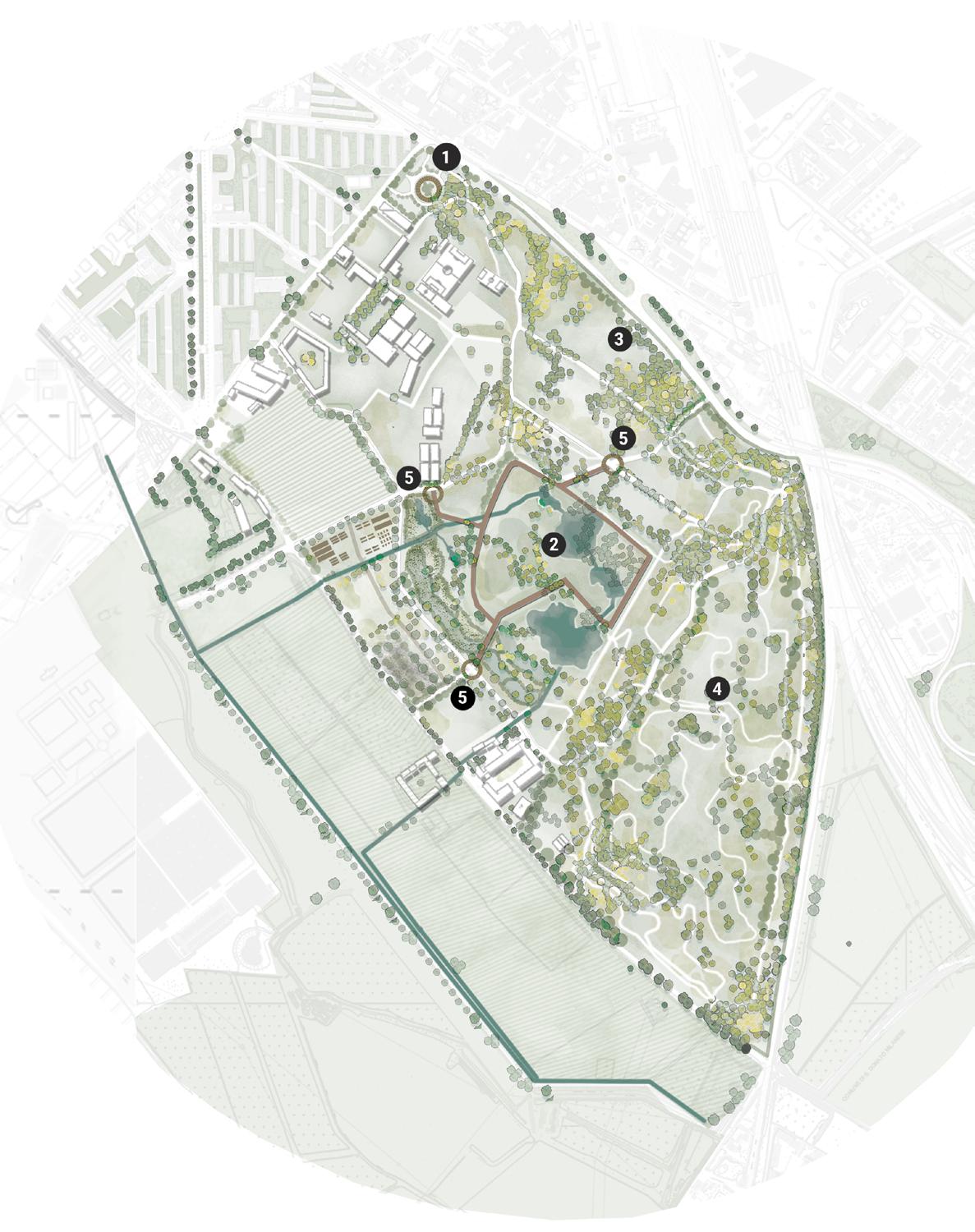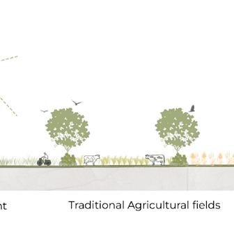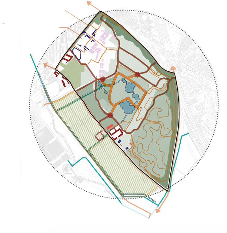 The landscape park envisions a seamless integration between urban life, industrial heritage, and ecological well-being. Through a repurposed cascina, visitors transition from the urban core to a vibrant green park that intersects with the EuroVelo international cycling network. The cascina becomes a social and productive anchor with open picnic spots, public areas, and research units that inform communities about advanced agricultural technologies.
