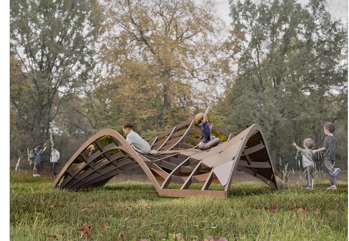Reclaimed timber is shaped into adaptive park play feature through innovative form-finding algorithms.