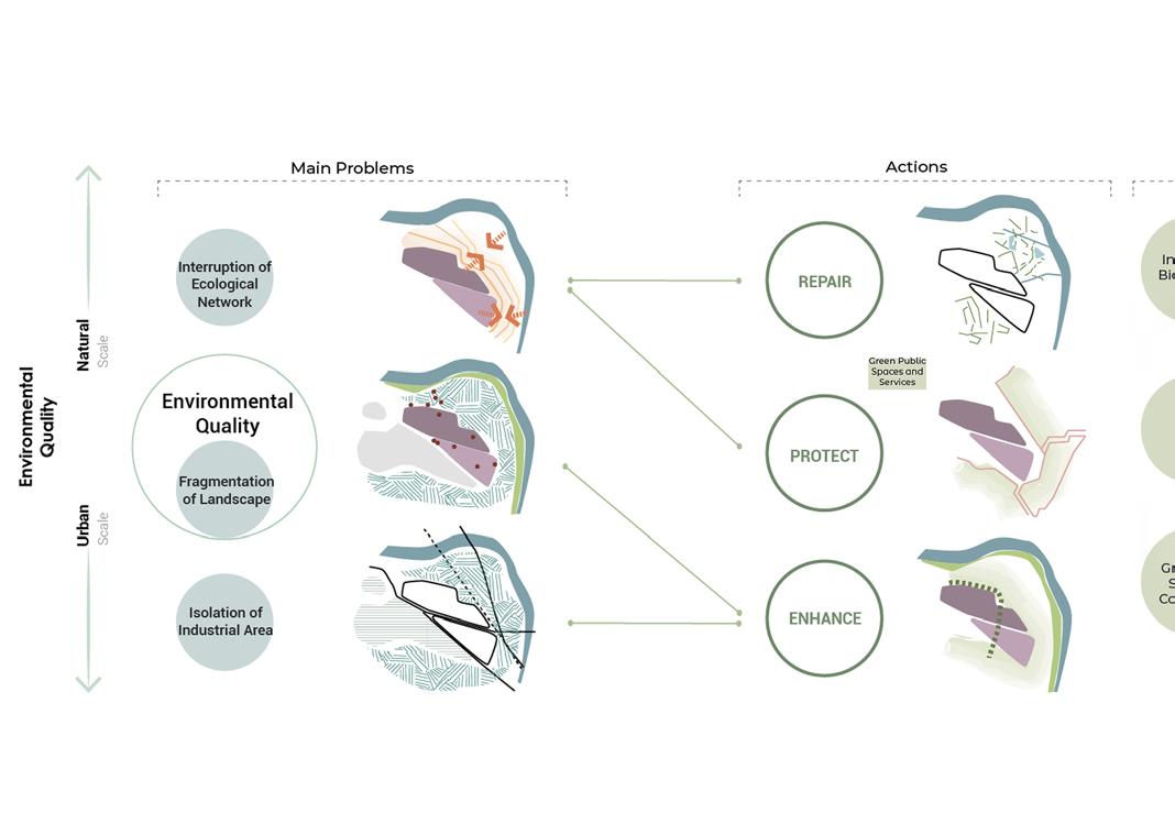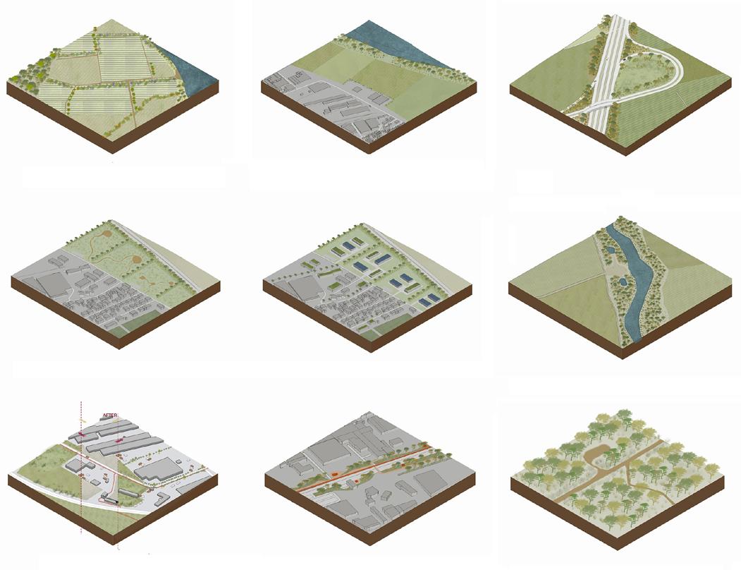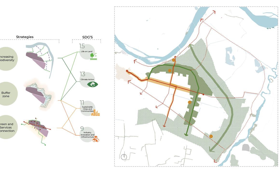 2. An intermediate space (buffer) between the industry and agricultural space, connecting the identified landscapes, focusing on environmental issues.