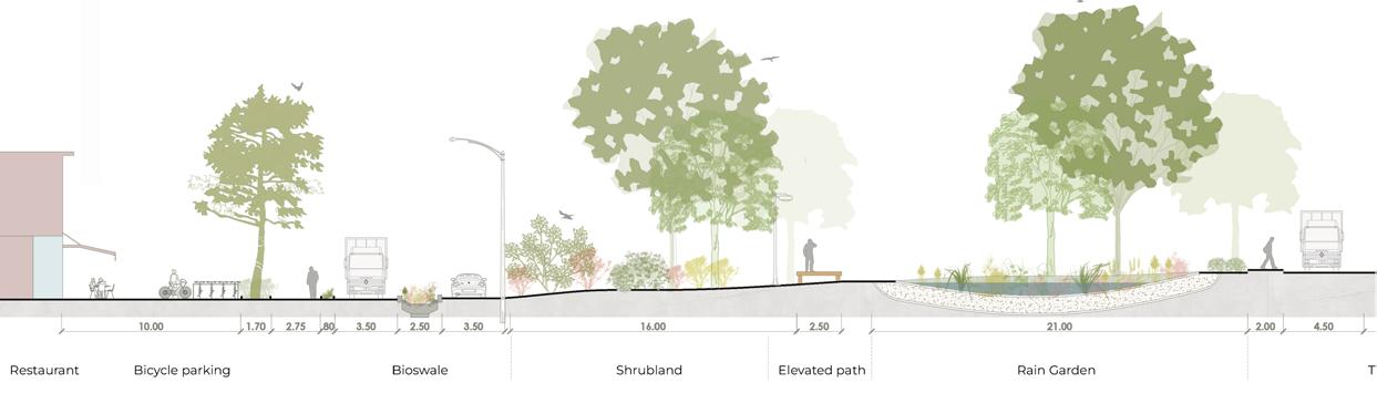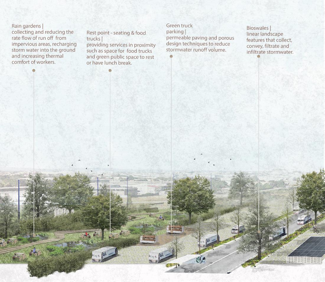 Along Via Caorsana, the service boulevard evolves into a linear park designed with rain gardens, bioswales, and green parking to capture runoff, reduce flood risk, and cool the surroundings. These nature-based solutions reduce the urban heat island effect while providing shaded, welcoming resting zones for workers and drivers. The integration of water, vegetation, and public space transforms this infrastructure corridor into a resilient and human-centered urban landscape.