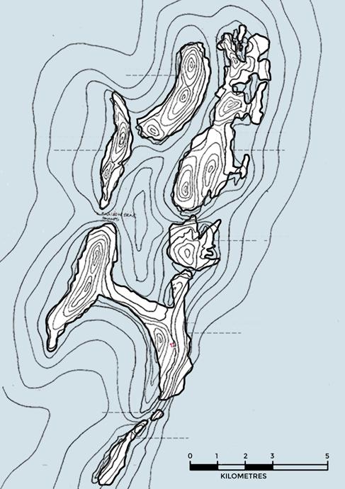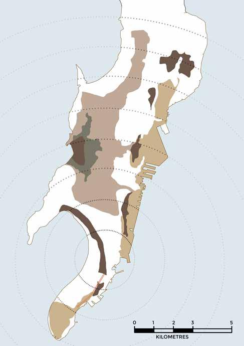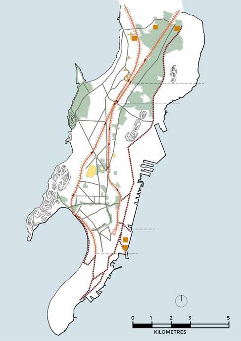 Contoured map of Seven Islands of mumbai shows the hilly terrain which was later flattened and the waste rocks were then used for reclamation, the flat land gained by reclamation also governs the path of the the railway route.