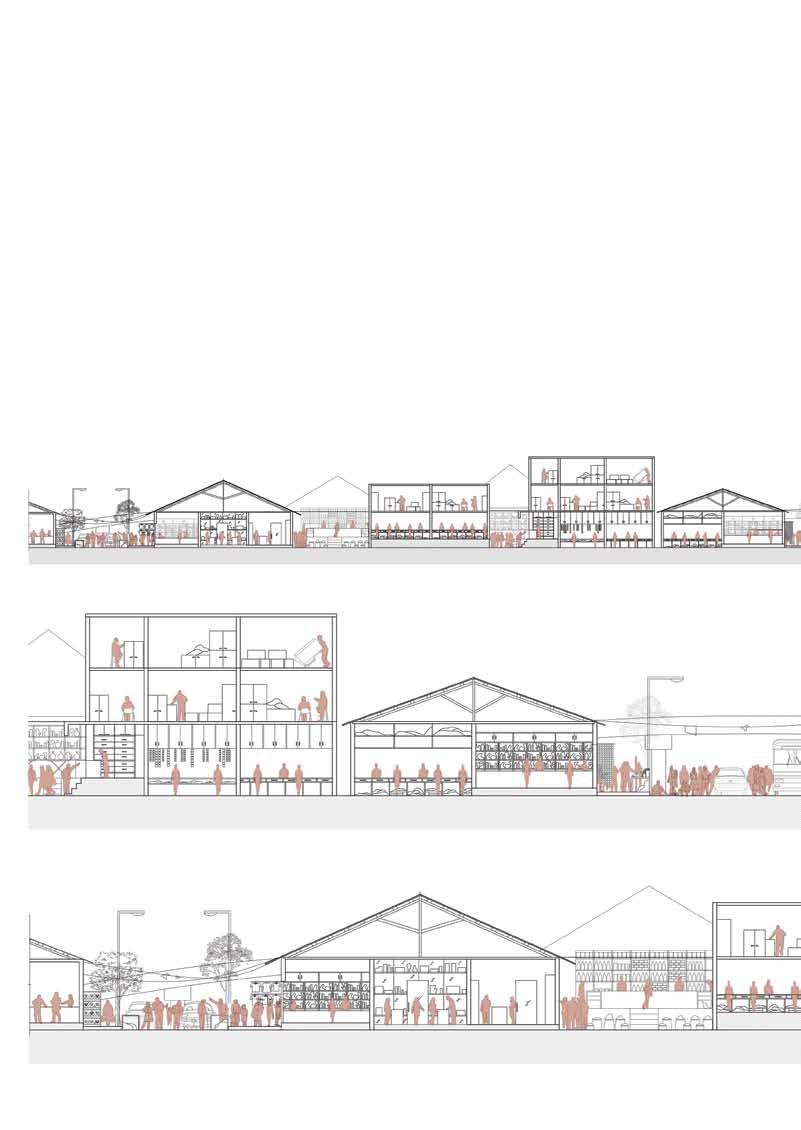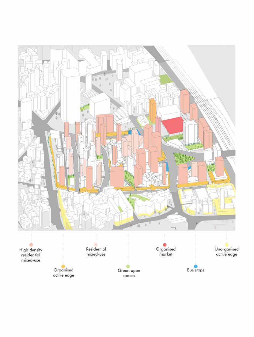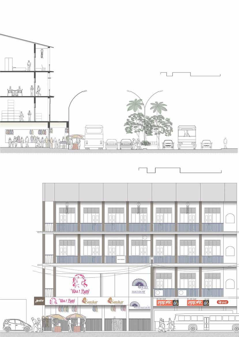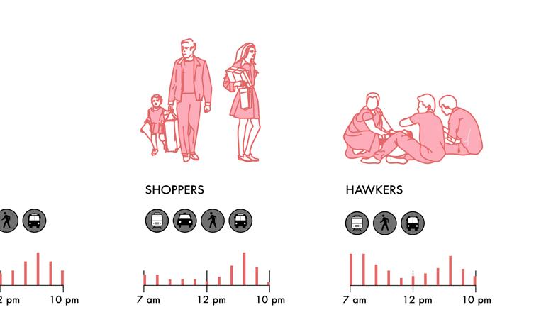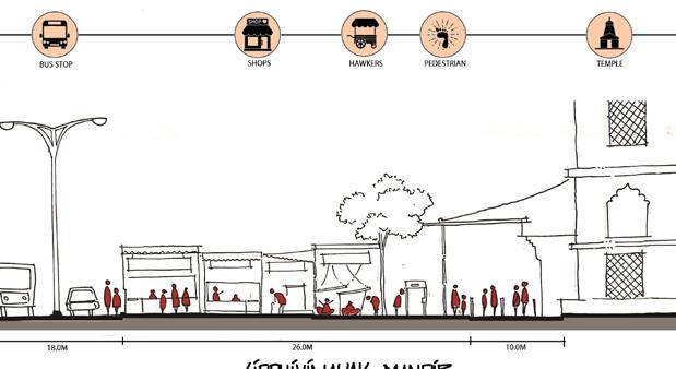 In this proposal, a walkway is created between the shops and hawkers lane such that the hawkers are facing towards the shops, to create a separate lane for the shoppers. A distinct sidewalk is created for the commuters along the vehicular road to segregate them from the shoppers crowd..