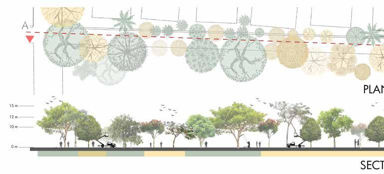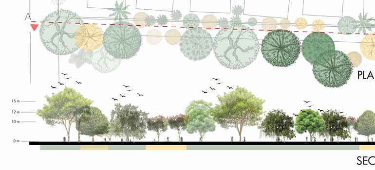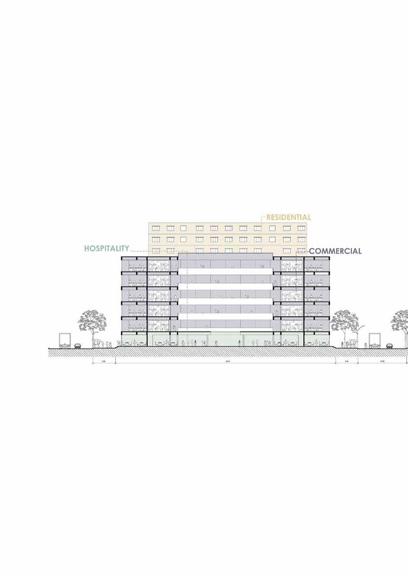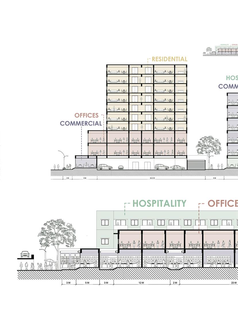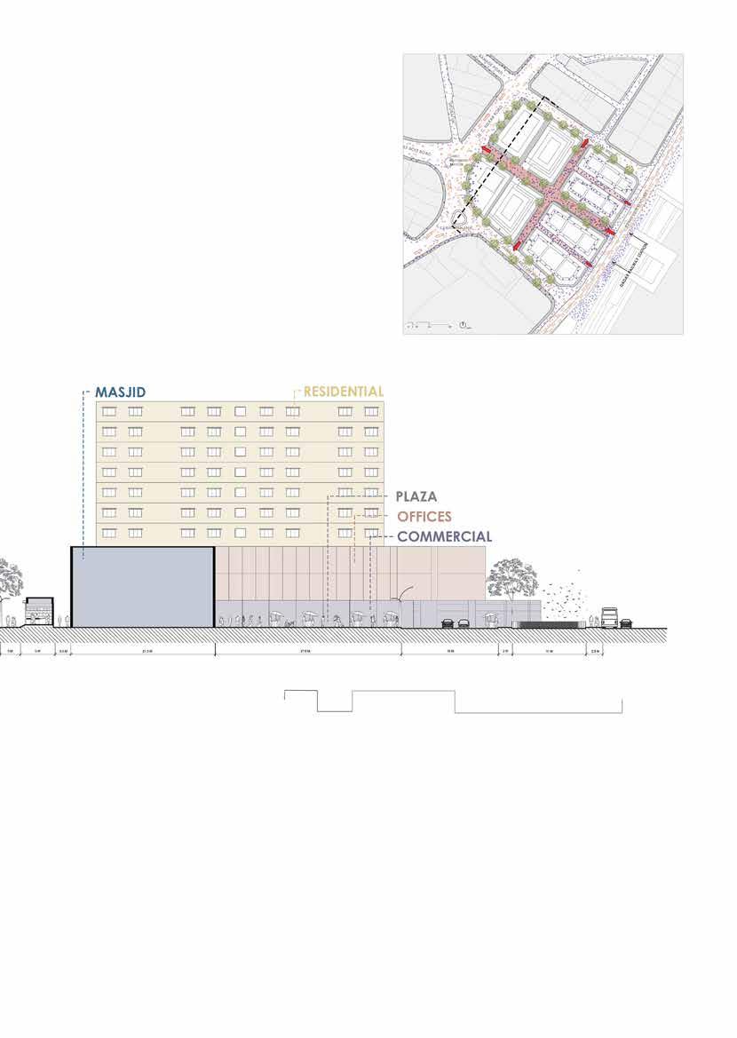 In this proposal, a walkway is created between the shops and hawkers lane such that the hawkers are facing towards the shops, to create a separate lane for the shoppers. A distinct sidewalk is created for the commuters along the vehicular road to segregate them from the shoppers crowd..