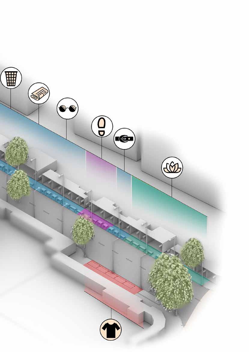 • Separate lanes for shops and floating population (Hawkers) • Shop get their own identity and separate lane • The commuters and shoppers must share the same path, which will result in overcrowding in the sidewalk.