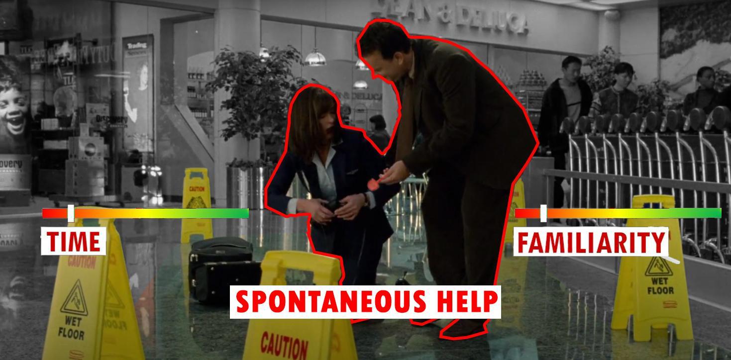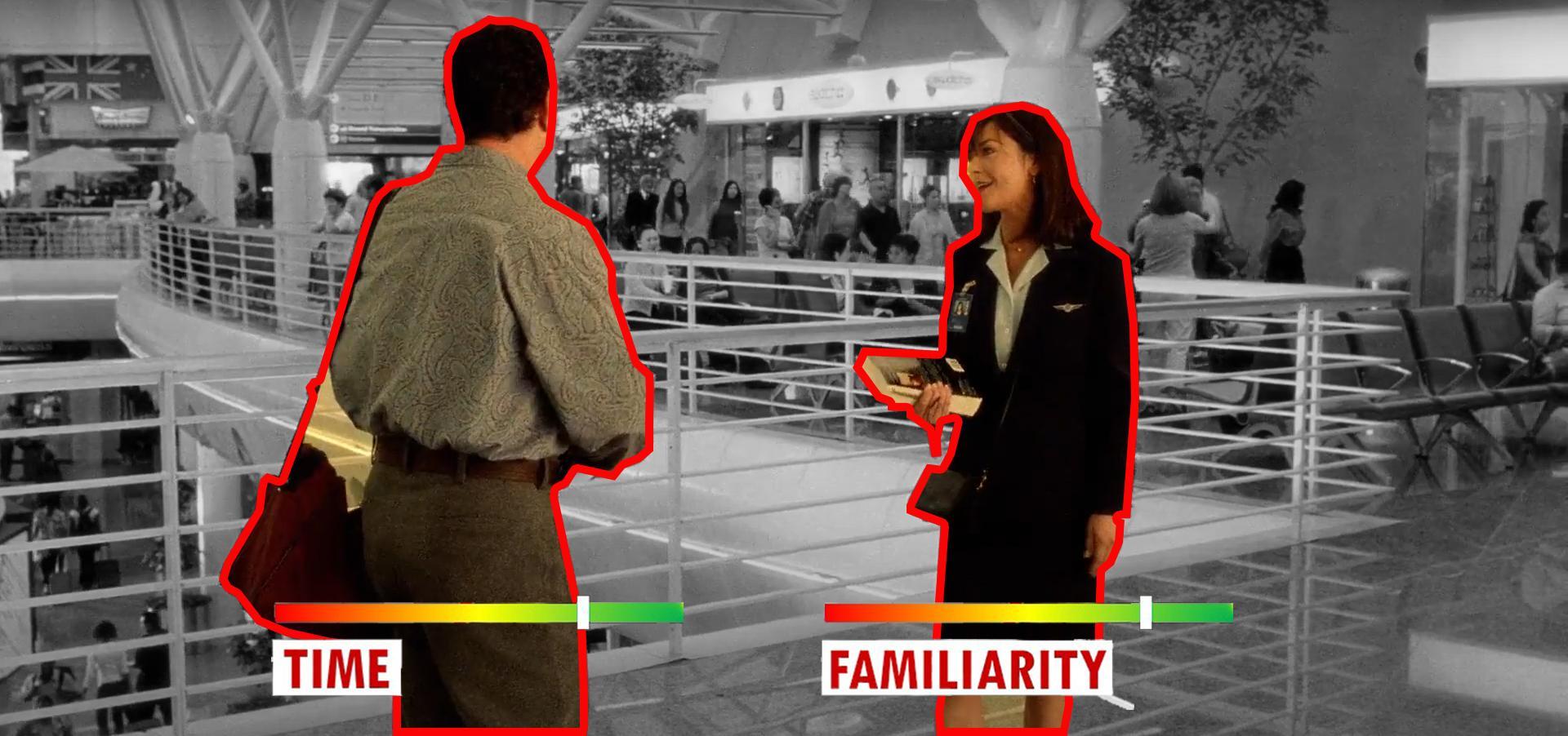 The concept of familiarity depends on the time of occupation in a space and the way the user interacts with it during that time. Just spending time always, does not enable one to become familiar to the space. If Victor or any of the other employees working there wouldn't have interacted with the space and its elements, they would not have been familiar with the space. The movie exhibits Victor’s transition from being new in the space to being the one who knows more than the managing staff.