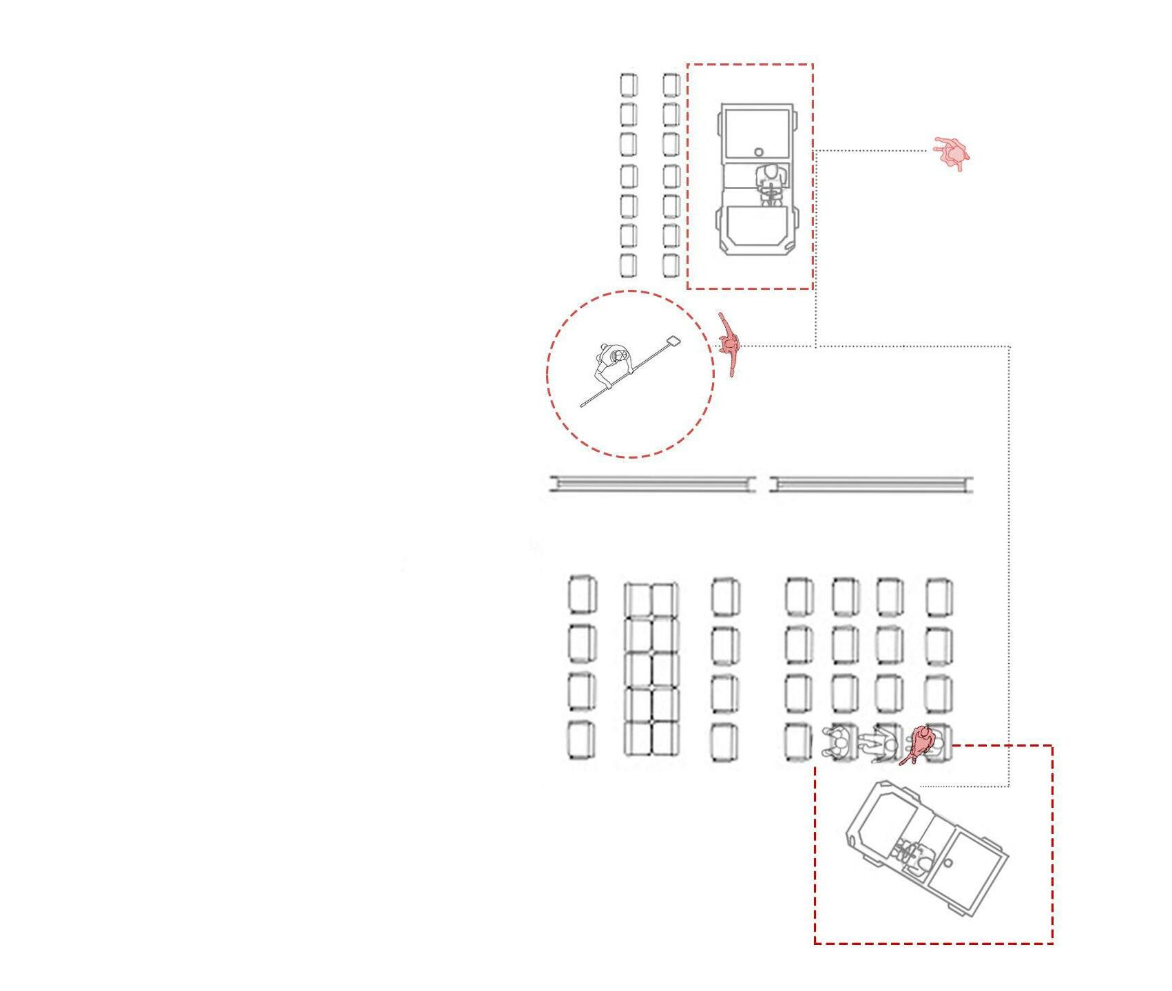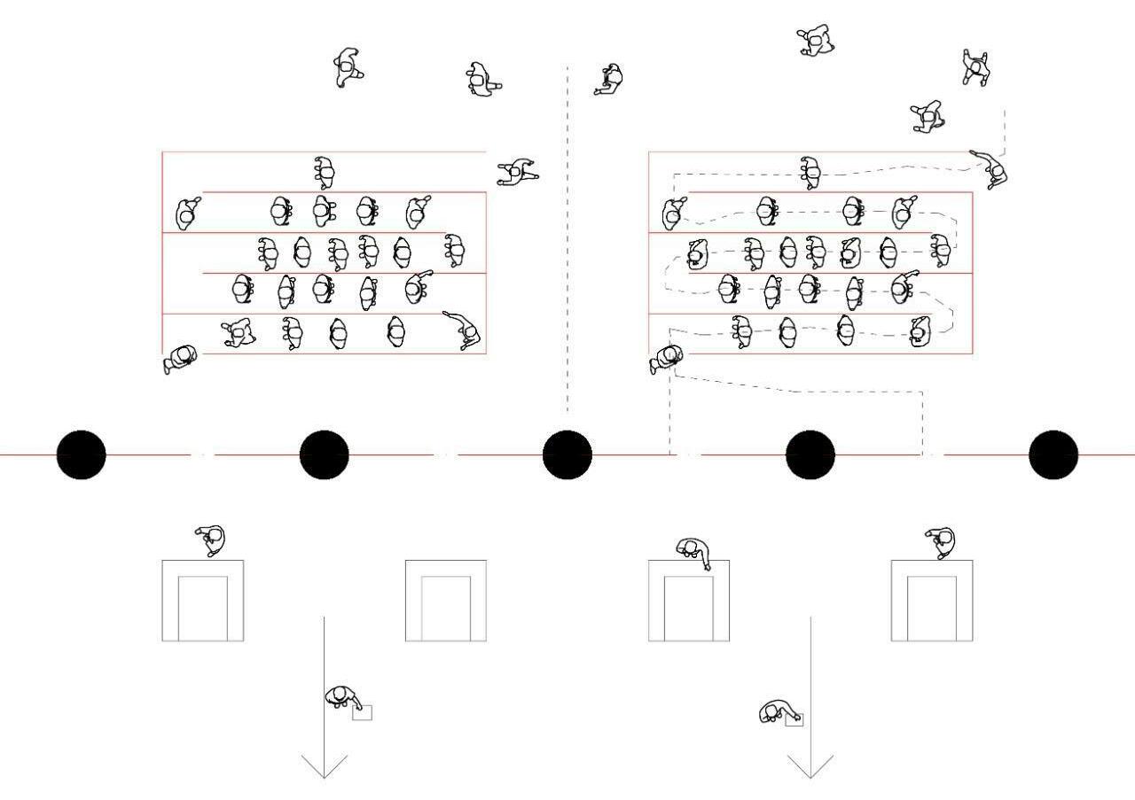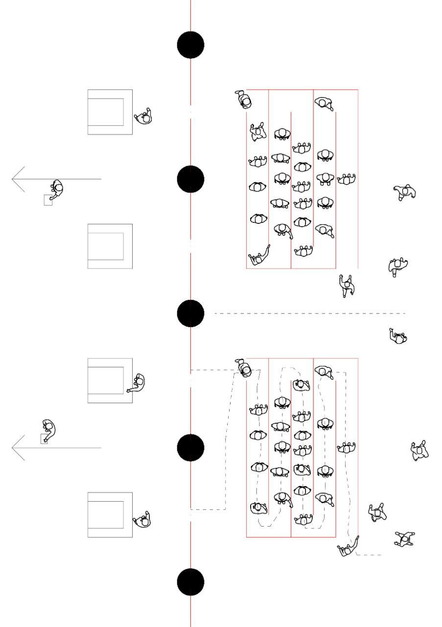 An Airport is a defined transitional threshold for passengers moving in and out driven by desire. It’s organization is sequenced in correspondence to a functional hierarchy (from transit points, to luggage and passport check) of occupiabilities that marks its power and formality in the user movements.