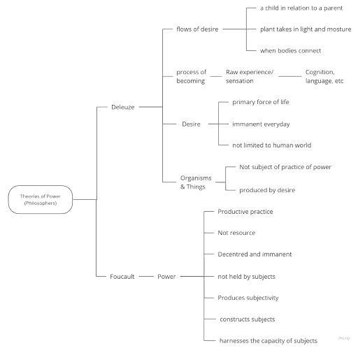 The Deleuzian thinking incorporates an understanding of power which is based on 'desire'. The major theory of power as dispersed micro practises is developed by Foucault through the conceptsofpanopticonanddisciplinarytechnology.