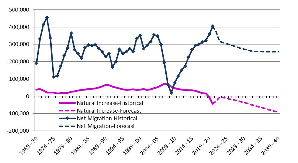 Florida’s population growth has mostly been from net migration. For the fiscal year forecast, net migration is projected to represent all of Florida’s population growth, as natural increase is expected to remain negative.