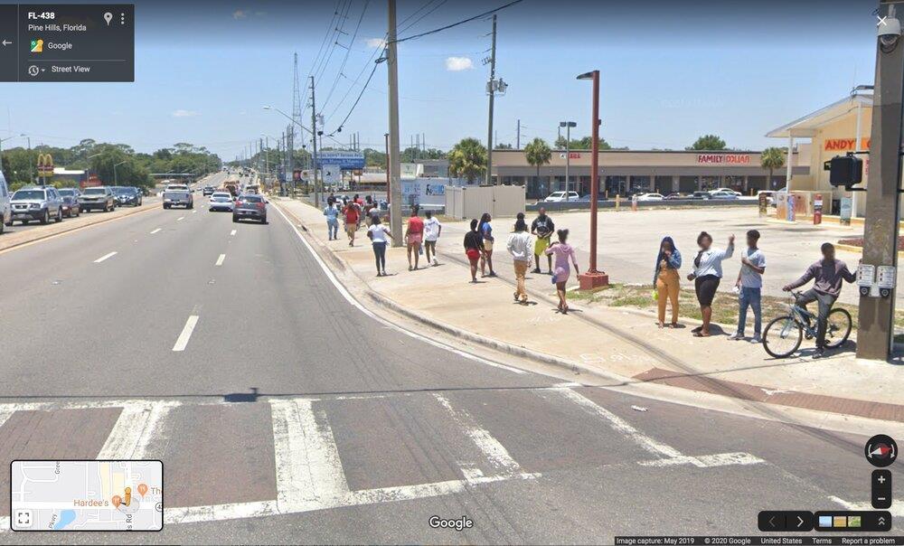 This is Evans High School in Pine Hills at the end of the school day. Children walking in an unsafe and inhospitable environment. (Other images available in the article or on Google Maps)
