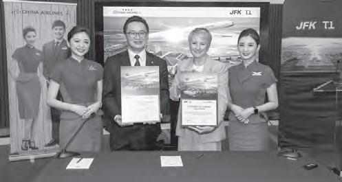 華航115年進駐紐約甘迺迪國際機場全新航廈華航總經理 陳漢銘(左2)與紐約甘迺迪國際機場新第一航廈(The New Terminal One at JFK)執行長奧蒙特(Jennifer Aument)(右2),共同簽署宣布策略合作。
