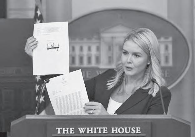 國白宮新聞秘書李威特於2025年7月7日在華盛頓白宮舉行的記者 會上,出示一封由美國總統川普簽署、致南韓總統李在明(Lee Jae Myung)的關稅信函。