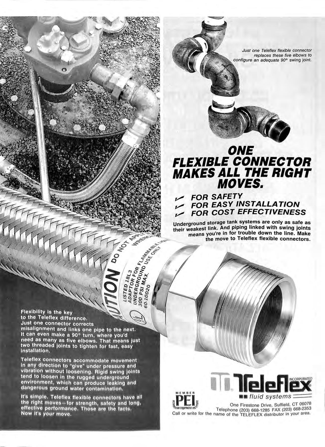 ONE FLEXIBLE CONNECTOR MAKES ALL THE RIGHT . MOVES. FOR SAFETY FOR EASY INSTALLATION FOR COST EFFECTIVENESS -Underground storage are _only as their weakest link. And p1pmg lmked with swmg 1omts means you're in for trouble down the line Make the move to Teleflex flexible connectors MEMBER PEI ••fluid systems One Firestone Drive, Suffield, CT 06078 Telephone (203) 668-1285 FAX (203) 668-2353 Call or write for the name of the TELEFLEX distributor in your area.