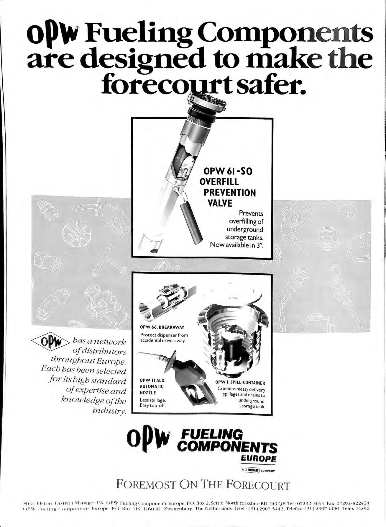 OPW 66. BREAKAWAY Pro t e ct di s p ense r fr om acci dent a l d rive away. OPW II ALD AUTOMATIC NOZZLE Less s pill age Easy to p -off. OPW 61-SO OVERFILL PREVENTION VALVE Prevents overfilling of underground storage tanks. Now available in 3" OPW I. SPILL-CONTAINER C o nt ain s messy de li very s pil lages and drains t o un dergro und sto r age tank FUELiNG COMPONENTS E UROP E A 2:IHJV@coMPAtllV F OREMOST O N THE FORECOURT V1 ikc fl;. I< 11 1 I )is1ric 1 l IK. ( >PW Fueling Components Europe PO Box 2, Settle, North Yorkshire BD 249 QE Tel. 07292 ·3655 , Fax : 07 29 2·822424. c 11' \lV hw l i ng ( ' imp< Hlt' nt ' Eu rnp(' P< l Box 11 ol I I60 A<. 7wanenburg, The Netherlands R ief ( 31) 2907·5442, Telefax : ( 3 1) 2907 608 I Telex i ';296